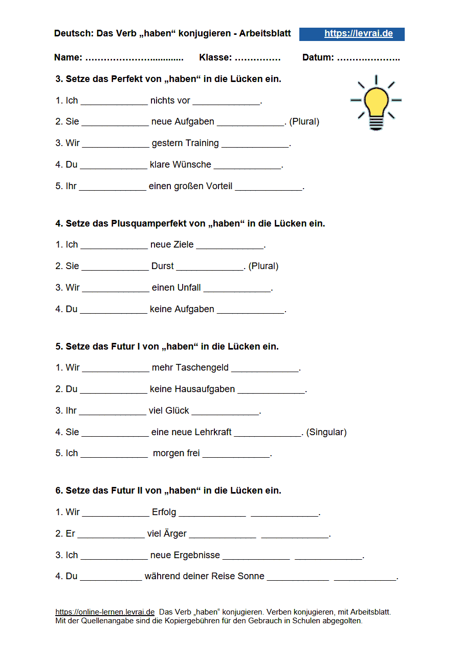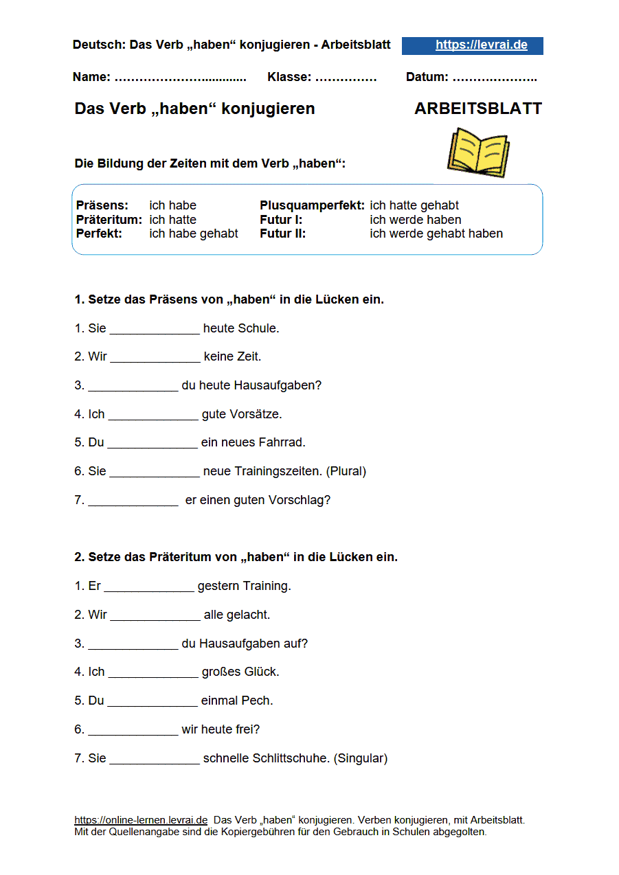 Das PDF-Arbeitsblatt für die Konjugation von „haben“ enthält die Arbeitsblätter und die Übungsblätter zum kostenlosen Ausdrucken.