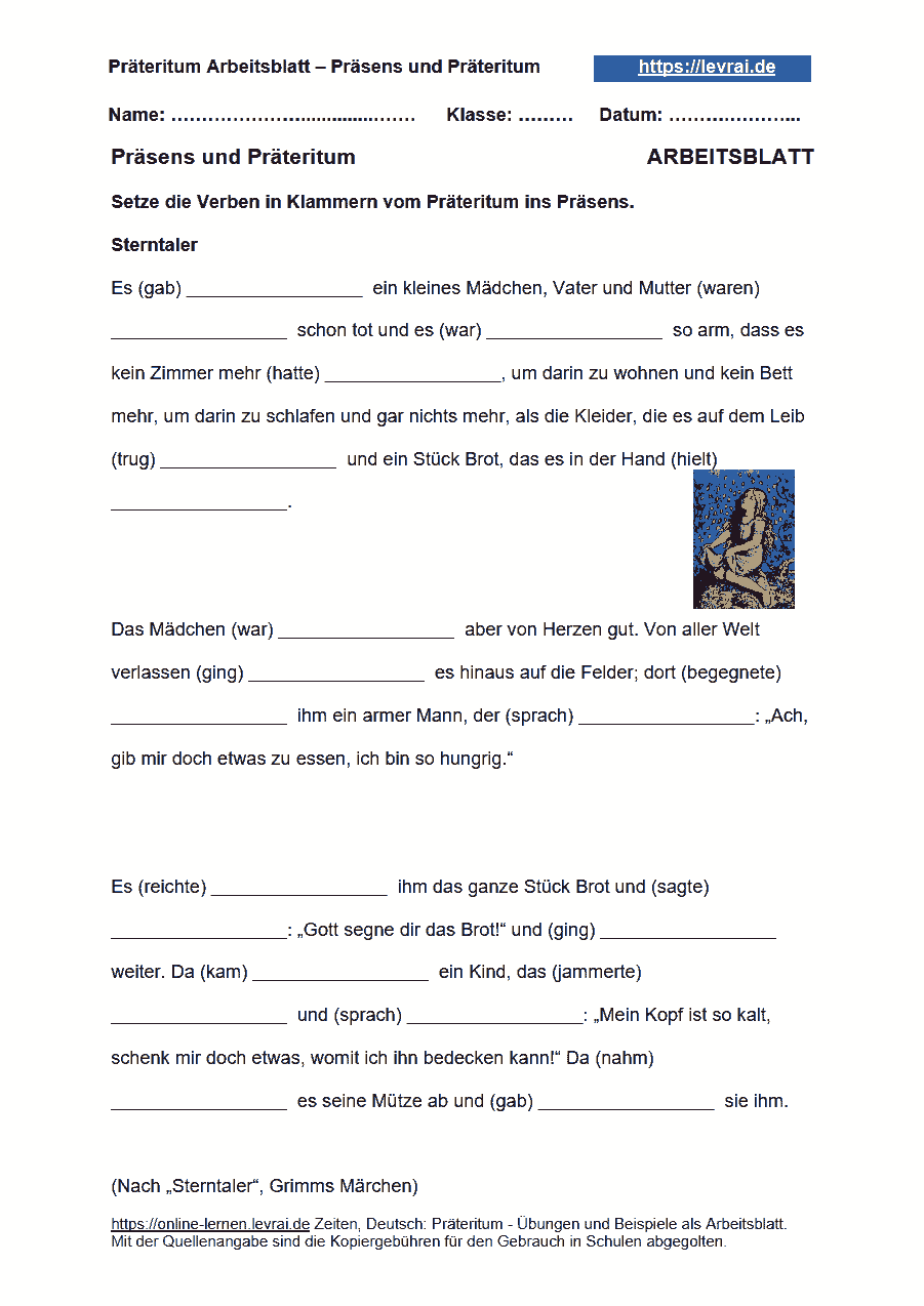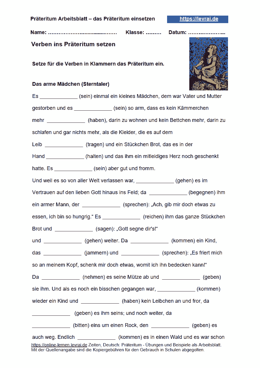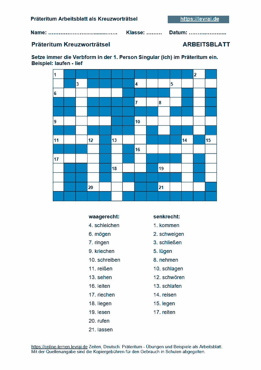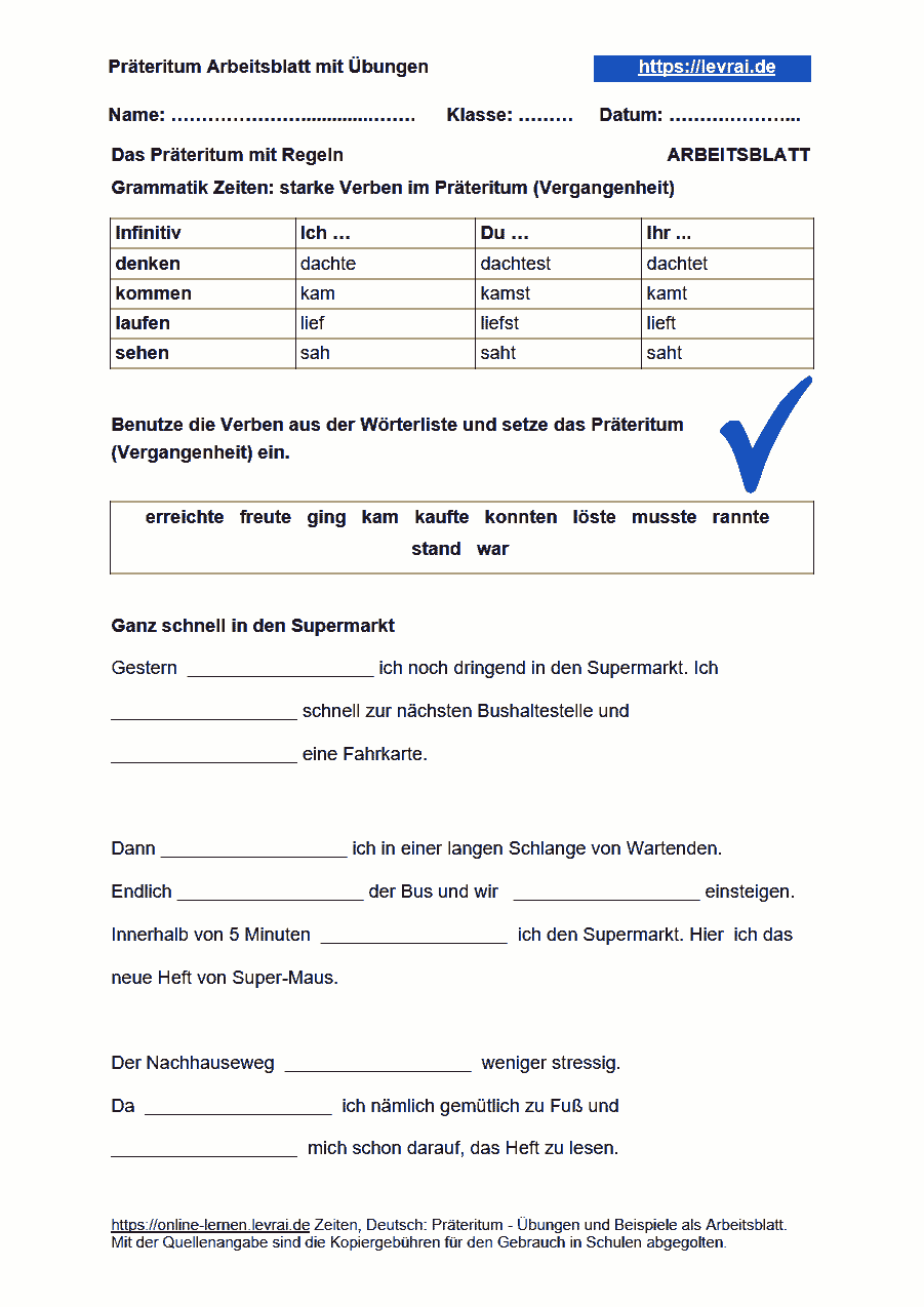 Hier siehst du Aufgabenblätter als Beispiele. Du kannst dir weitere Arbeitsblätter und Übungsblätter mit Lösungen herunterladen, die du oben auf dieser Seite als kostenlose PDF für das Präteritum findest.