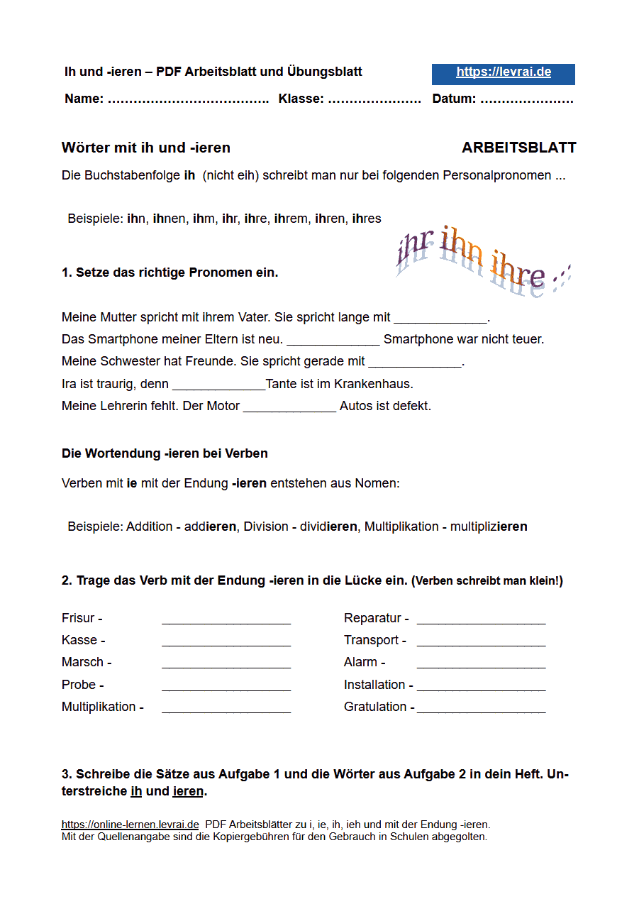 Hier siehst du Aufgabenblätter als Beispiele. Du kannst dir weitere Arbeitsblätter und Übungsblätter mit Lösungen herunterladen, die du oben auf dieser Seite als kostenlose PDF für i, ie, ieh und -ieren findest.