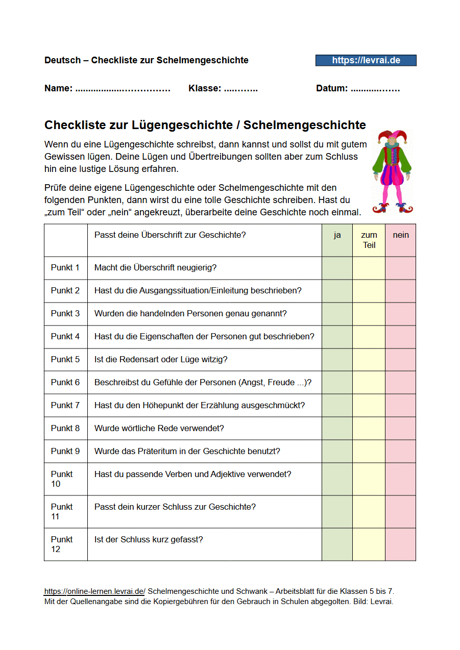Prüfe deine eigene Lügengeschichte oder Schelmengeschichte mit den folgenden Punkten, dann wirst du eine tolle Geschichte schreiben. Hast du „zum Teil“ oder „nein“ angekreuzt, überarbeite deine Geschichte noch einmal.