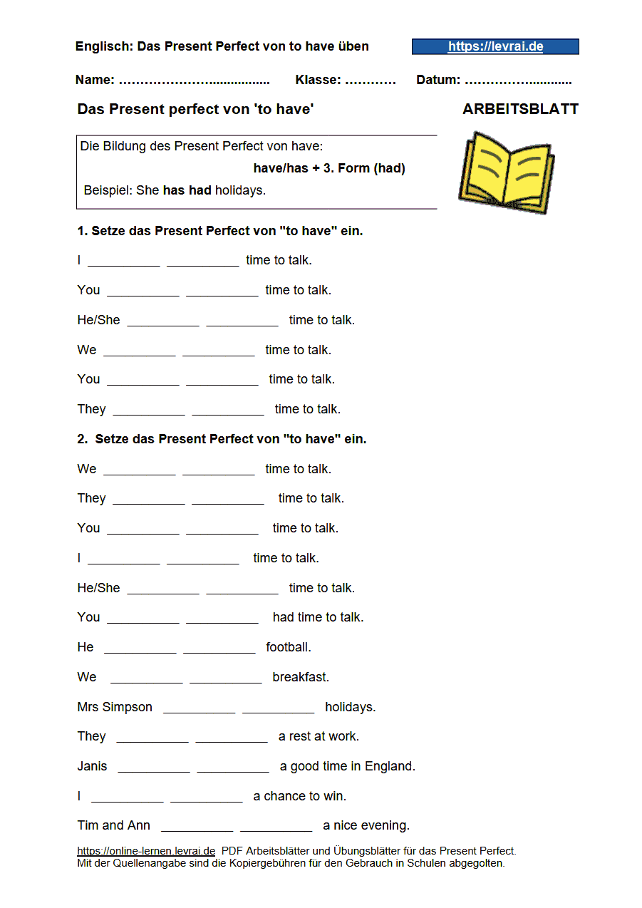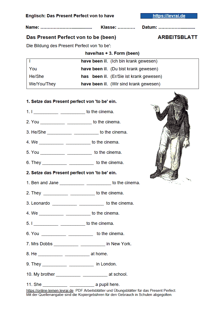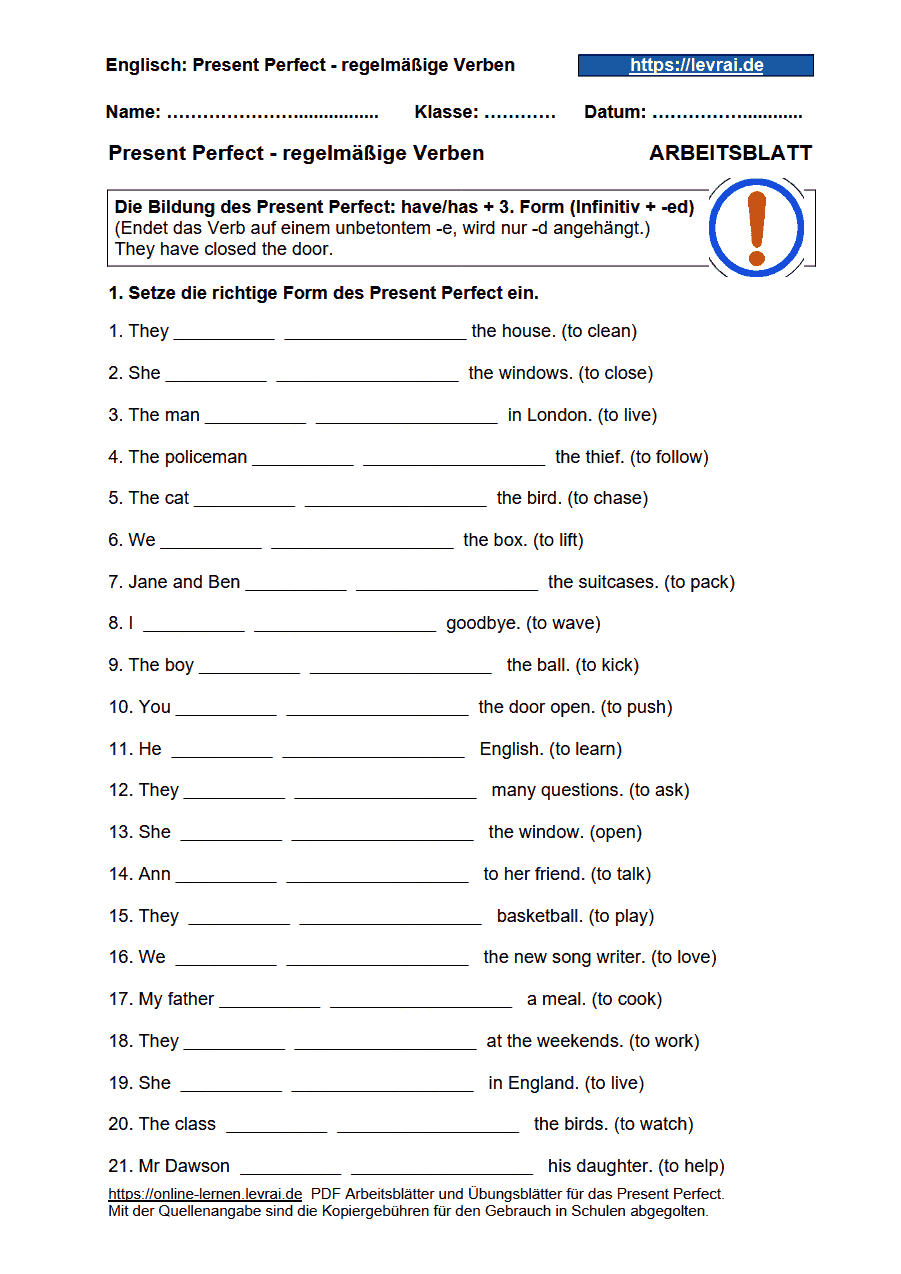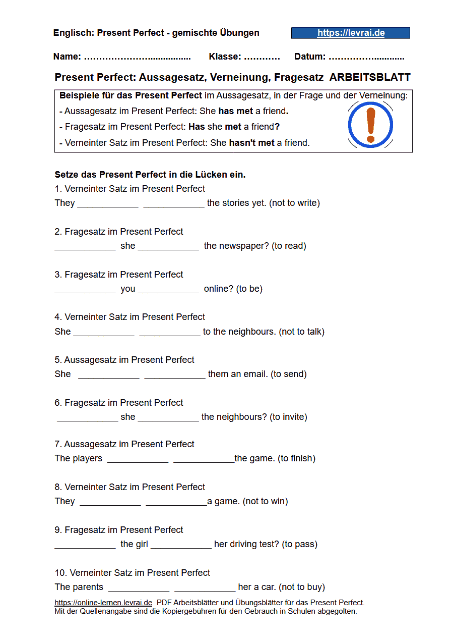 Das Present Perfect und die Verwendung - Arbeitsblätter mit Übungen zum Ausdrucken. Kostenlose Arbeitsblätter Englisch. Englisch Arbeitsblätter für das Present Perfect mit einfachen Beispielen und Regeln zum Online-Lernen mit Erklärung.