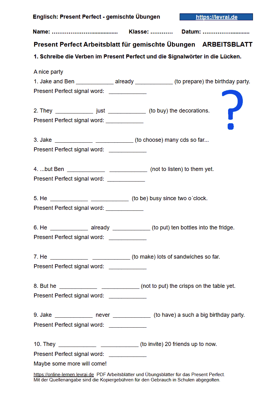 13 Arbeitsblatt Present Perfect gemischte Übung mit Hilfe