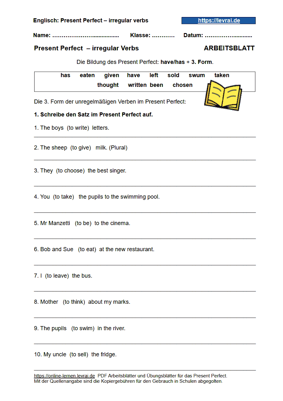 10 Arbeitsblätter Present Perfect unregelmäßige Verben PDF