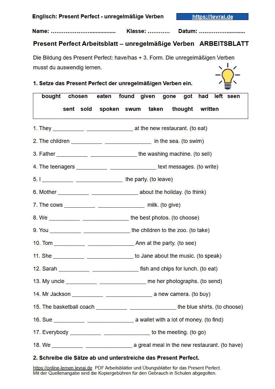 18 Arbeitsblätter Present Perfect unregelmäßige Verben Lösungen