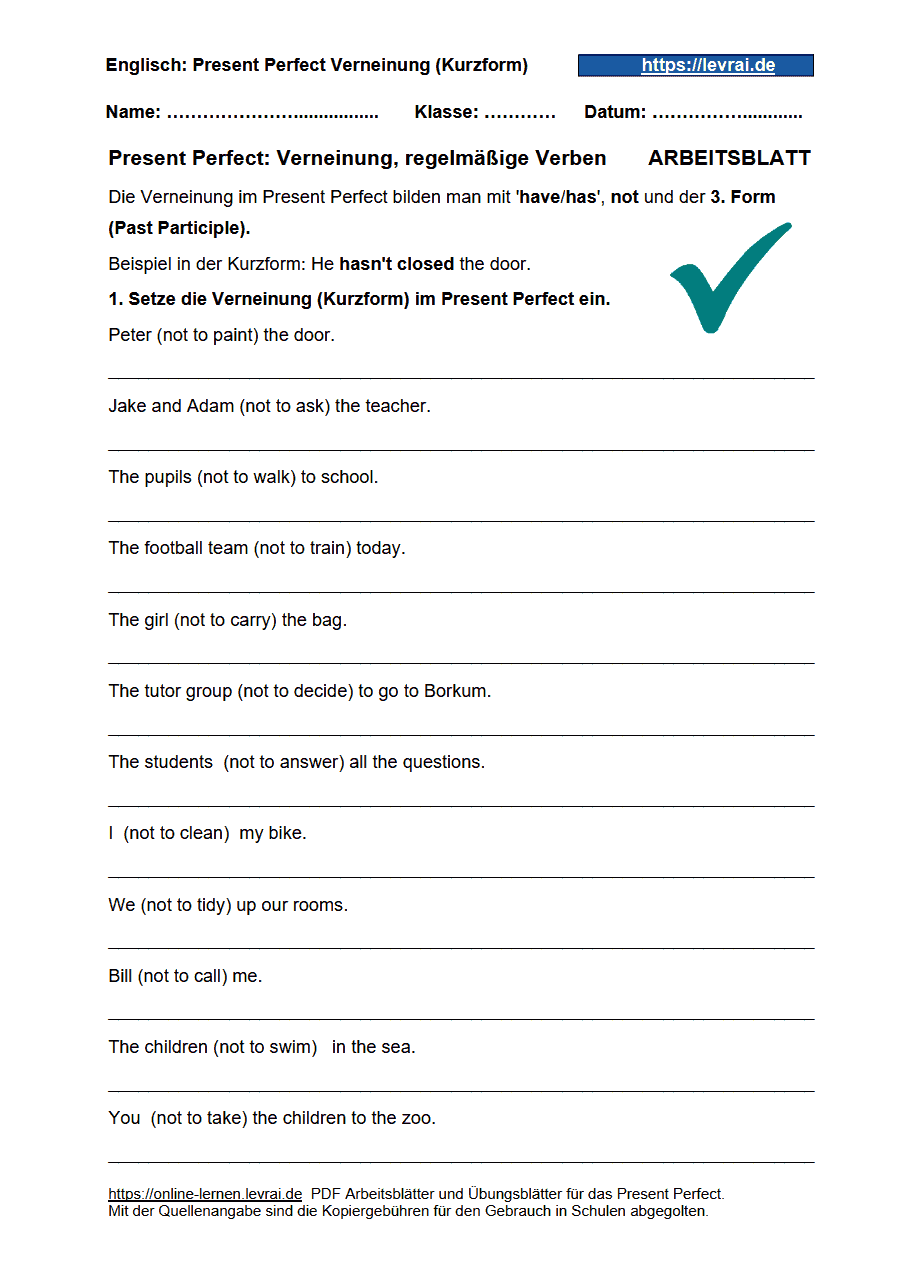 29 Verneinung im Present Perfect Kurzform - Langform Arbeitsblatt