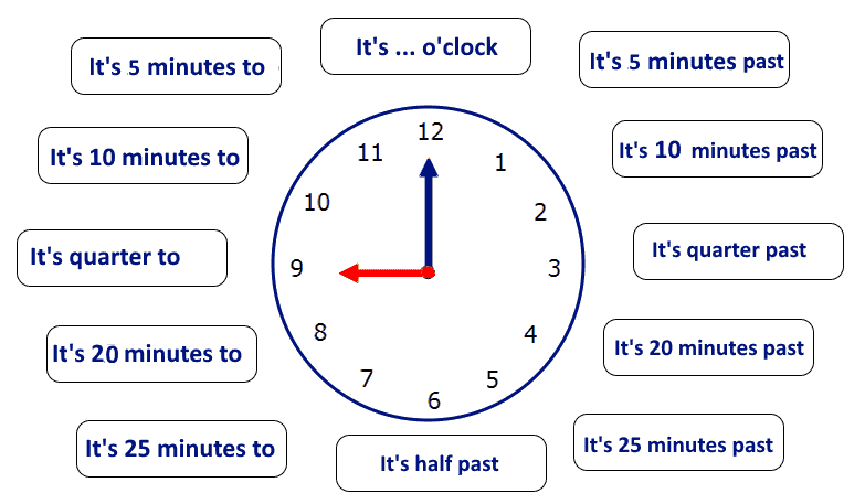 Englisch-Übungen für die englischen Uhrzeiten mit Regeln, Beispielen und Lösungen mit PDF-Arbeitsblättern für die Uhrzeit (exercises time expressions) und Beispielen zum Online-Lernen. Alle Aufgaben gibt es mit Erklärungen zu den Themen: „a quarter“, „half past“, „a quarter to“ und „a quarter past“. Die englischen Uhrzeit-Übungen sind geeignet für Klasse 5, Klasse 6, Klasse 7, Klasse 8 und Klasse 9.
