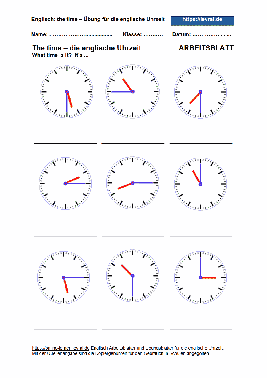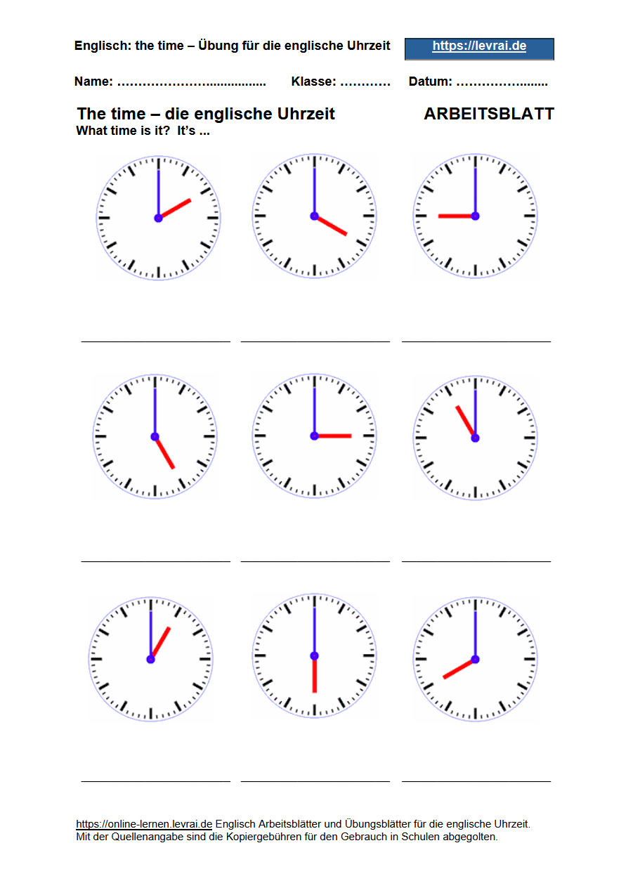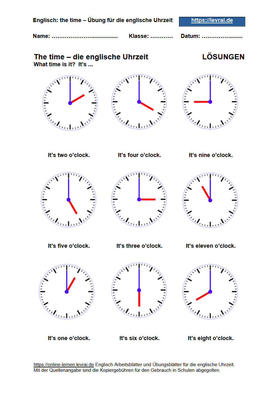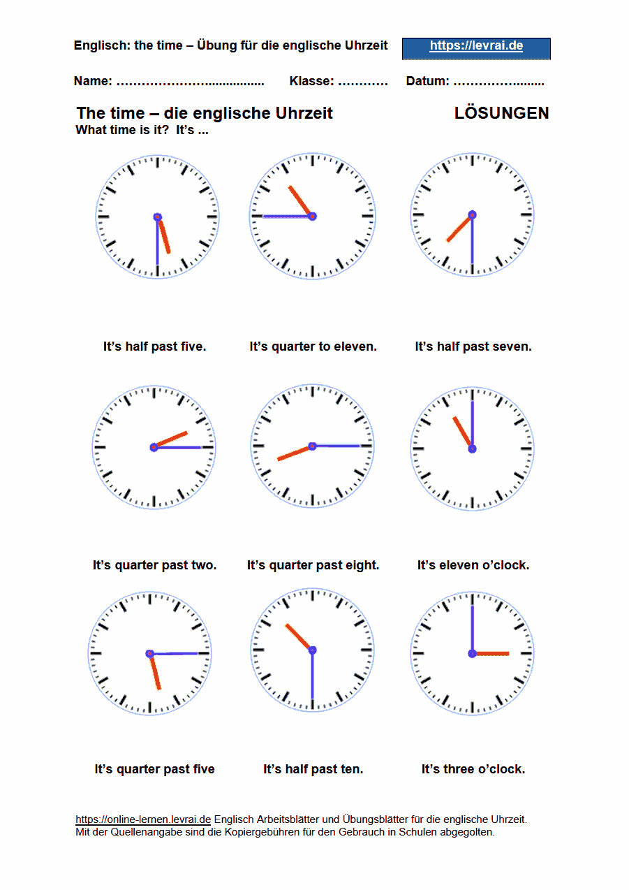 Mit den Arbeitsblättern für „the time“(die englische Uhrzeit) kannst du deine eigenen Antworten kontrollieren. Die PDF-Arbeitsblätter für „the time“ (die englische Uhrzeit) enthalten auch die Lösungen.