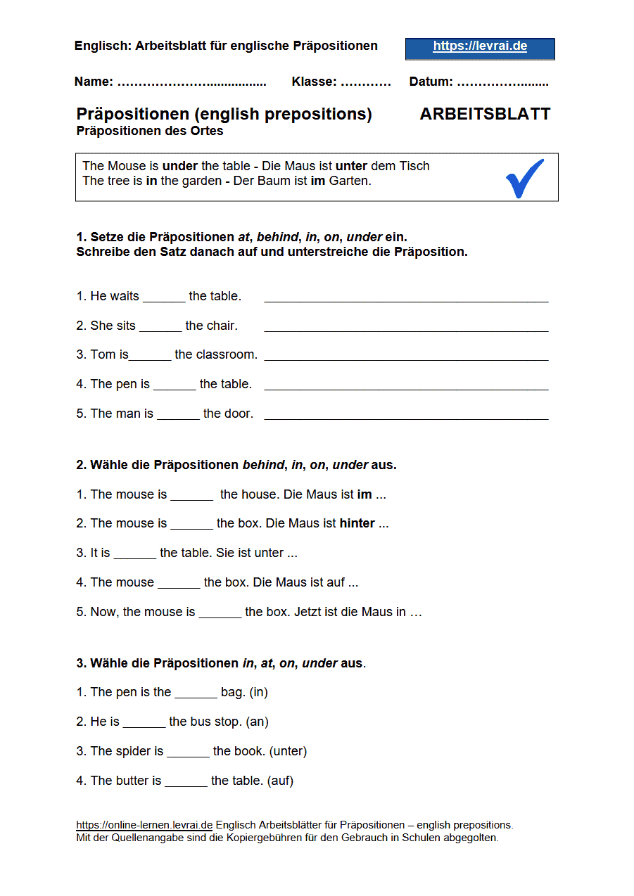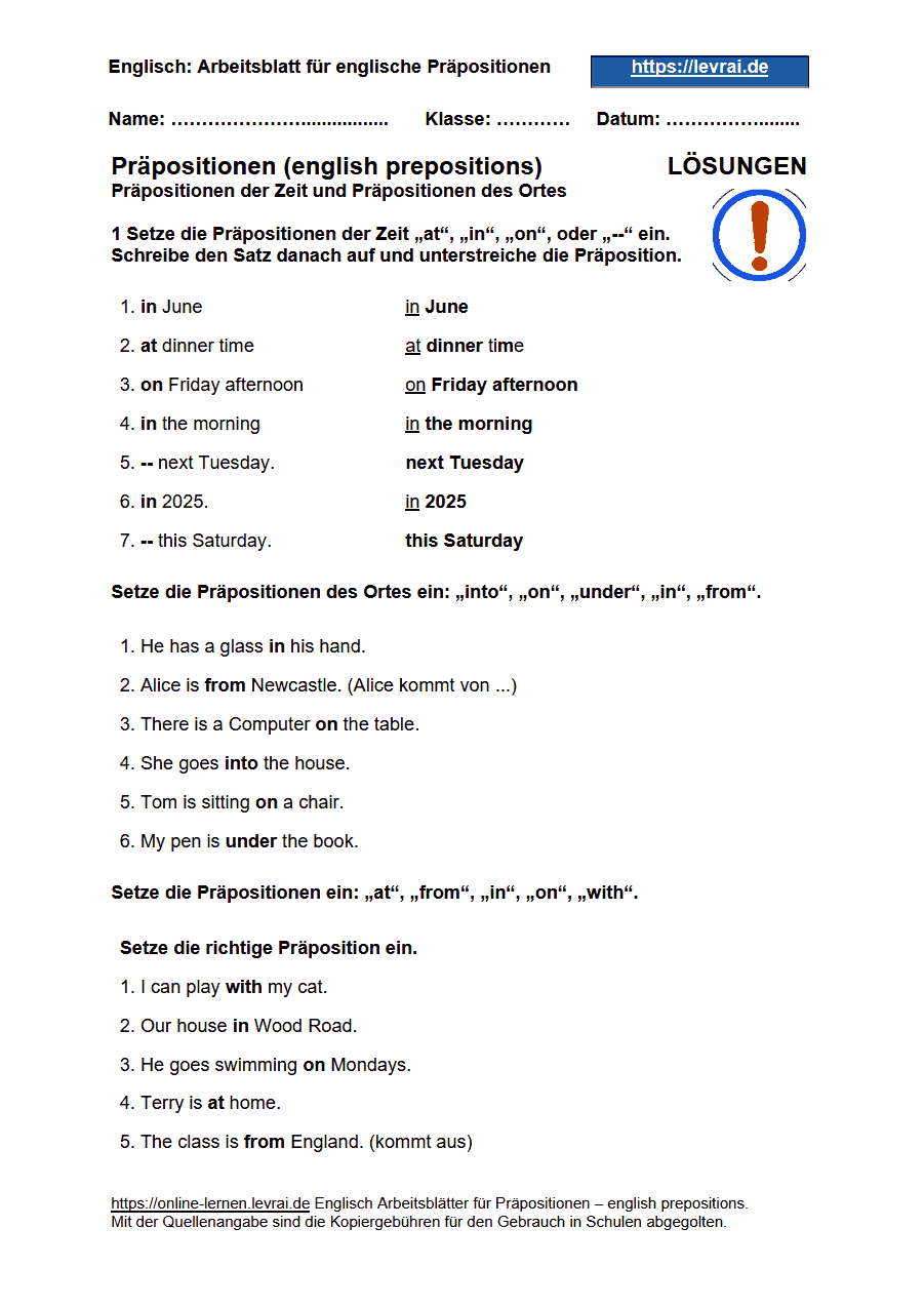 PDF-Arbeitsblätter für die Präpositionen der Zeit des Ortes (prepositions of time, prepositions of place). Die PDF-Arbeitsblätter für die Präpositonen des Ortes und der Zeit enthalten auch die Lösungen.
