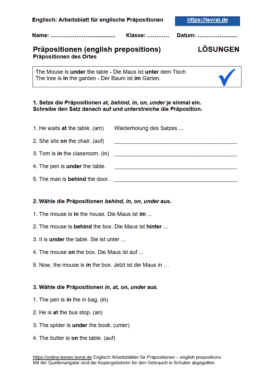 Kontrolliere deine Arbeitsblätter für die englischen Präpositionen (prepositions). Die PDF-Arbeitsblätter für die englischen Präpositionen (prepositions) enthalten auch die Lösungen.