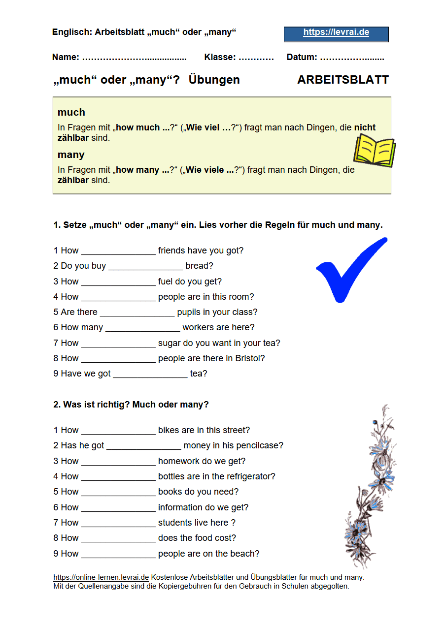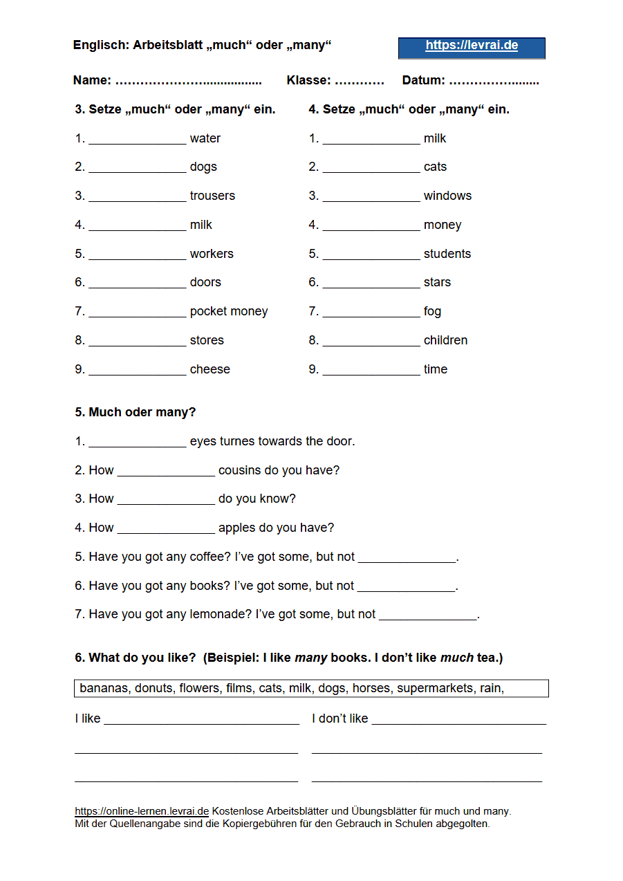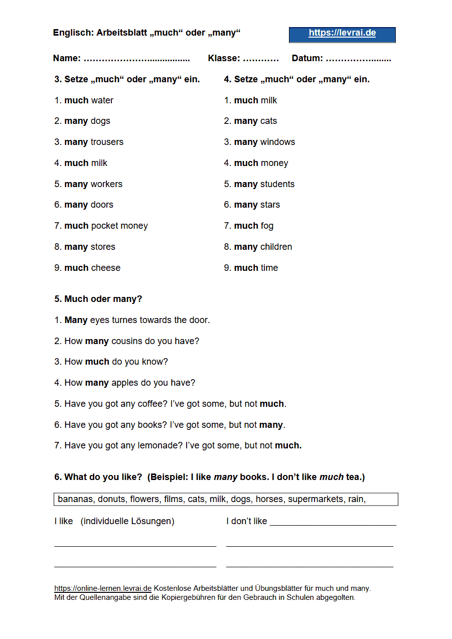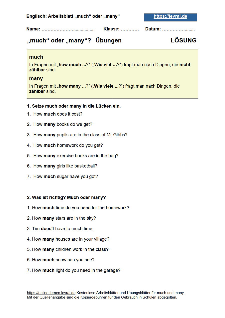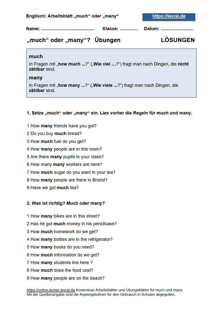 Kontrolliere deine Arbeitsblätter für much und many. Die PDF-Arbeitsblätter (2) für much und many enthalten auch die Lösungen.