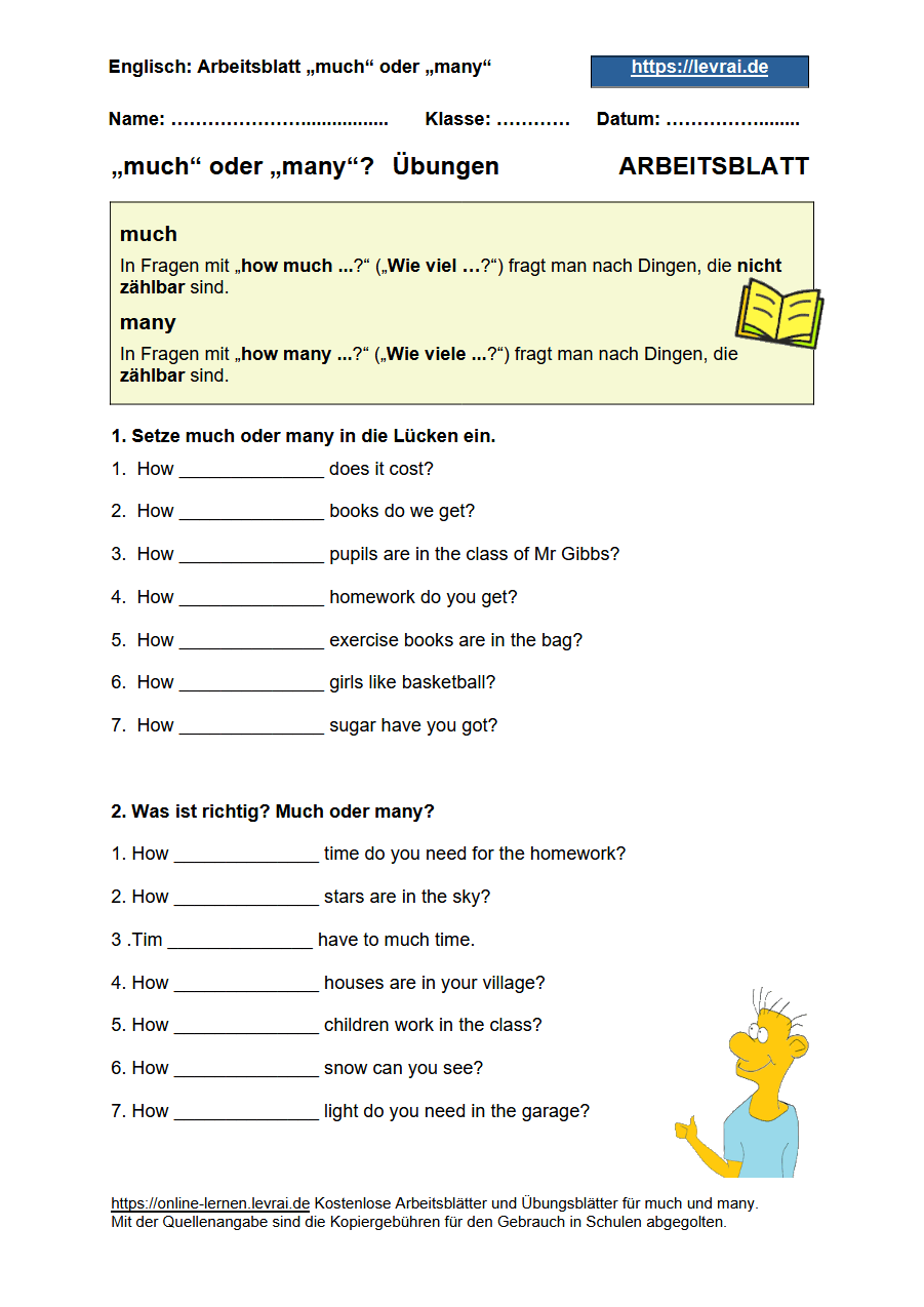 Englisch-Übungen für much und many mit Regeln, Beispielen und Lösungen als PDF-Arbeitsblätter.