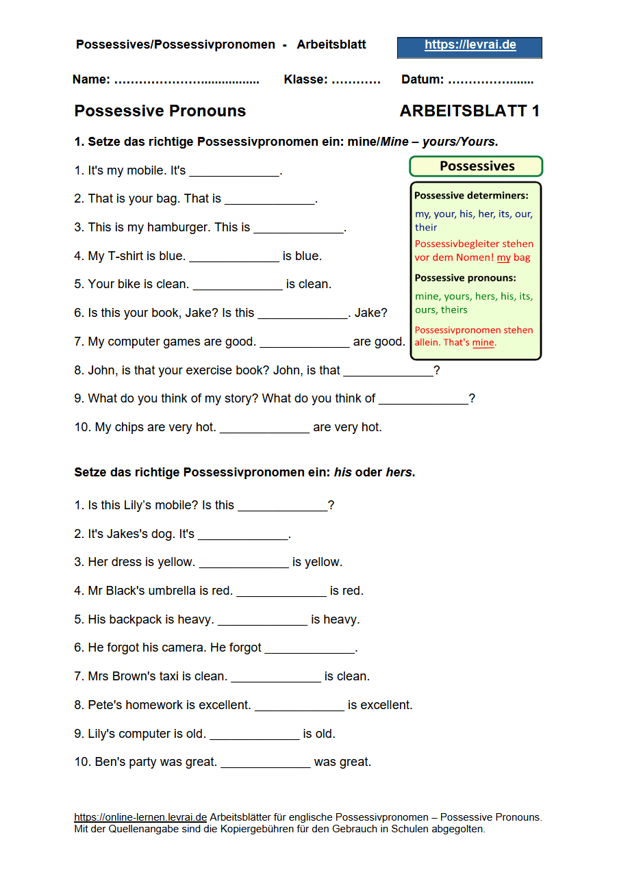 Englische Grammatik-Übungen zu Possessivpronomen und Possessivbegleitern. Possessivpronomen/Possessive Pronouns (mine, yours, his, hers, ours, theirs) und Possessive Determiners/Possessivbegleiter (my, your, his, her, its, our, their). Lerne mit der Liste für Possessive Pronouns/englische Possessivbegleiter mit Erklärungen, Regeln und Beispielen. Doie englischen Possessive-Pronouns-Übungen eignen sich für Klasse 5, Klasse 6, Klasse 7, Klasse 8 und Klasse 9.