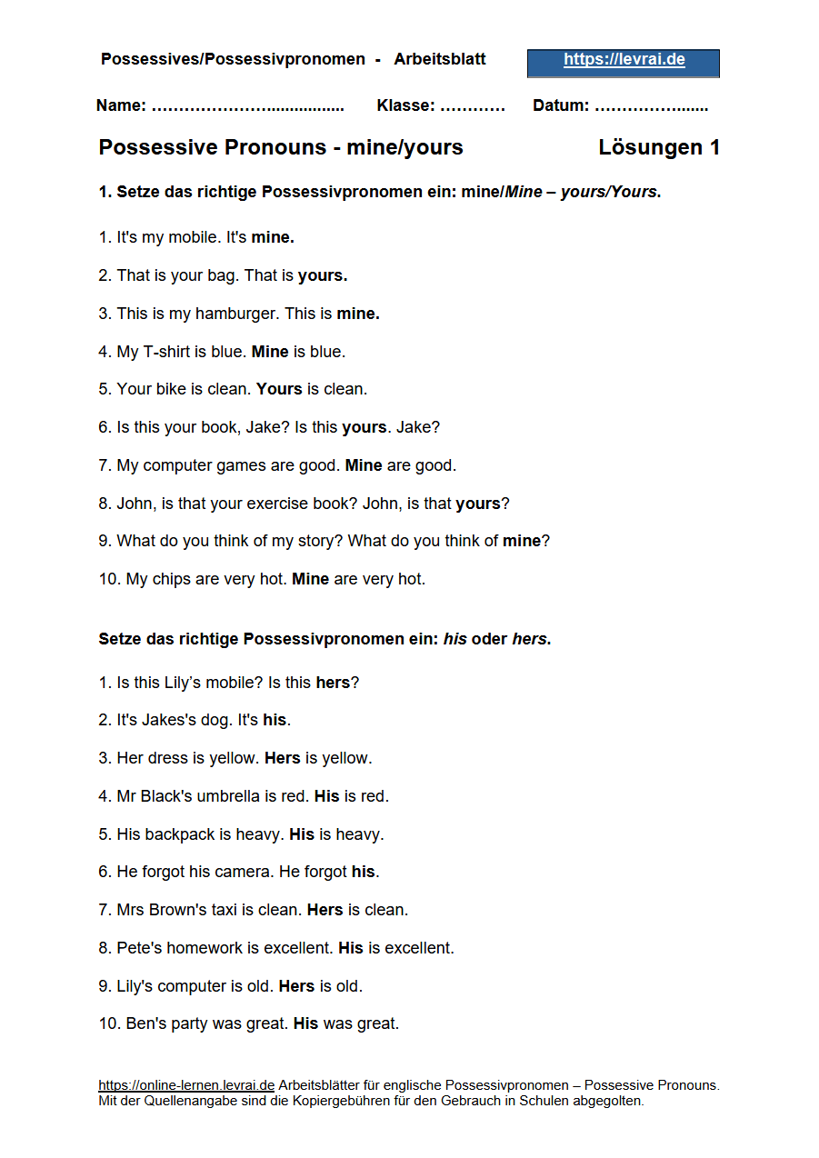 PDF-Arbeitsblätter für englische Possessivpronomen/Possessivbegleiter (possessive pronouns/possessive determiners) mit Lösungen. Die PDF-Arbeitsblätter für possessive pronouns/possessive determiners Übungen enthalten alle Übungen mit den Lösungen.