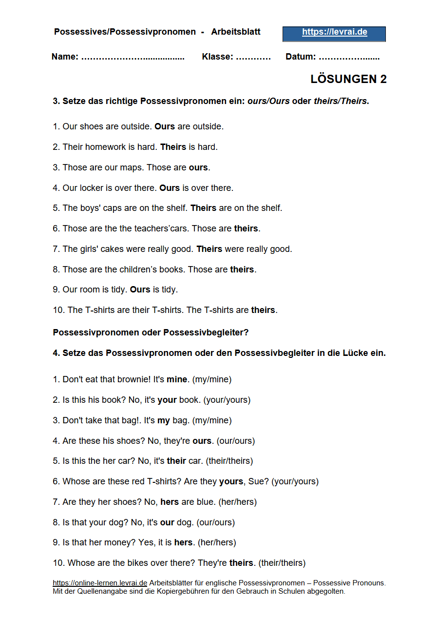 Lösung zum Arbeitsblatt 2 und Arbeitsblatt 3 für englische Possessivpronomen (possissive pronouns) und Possessivbegleiter (possessive determiners).