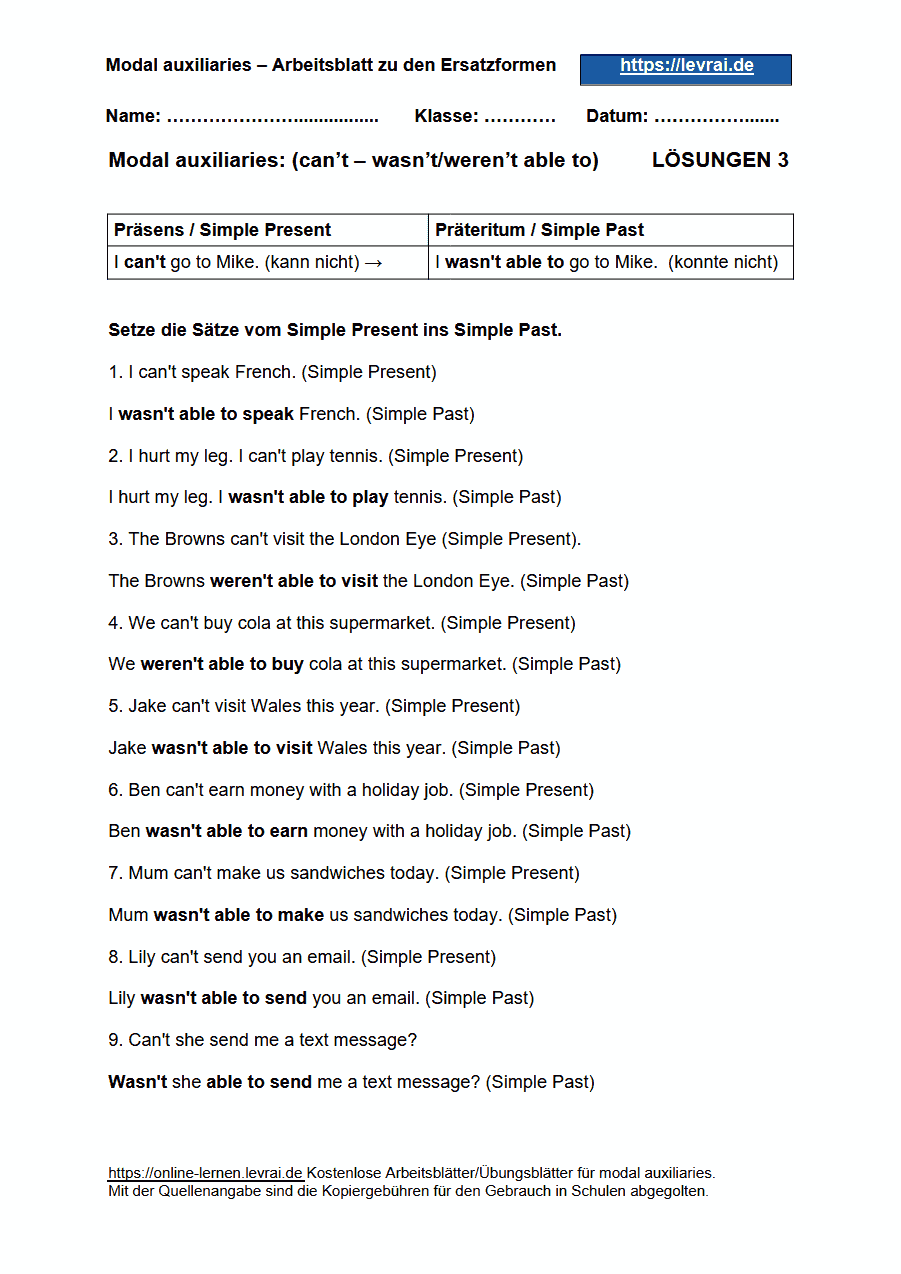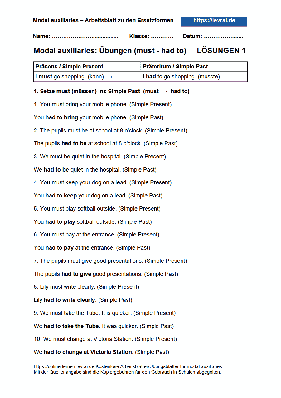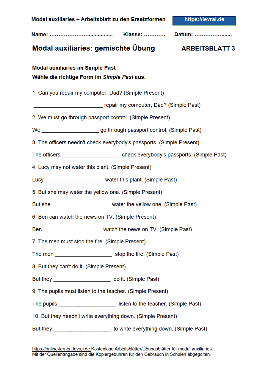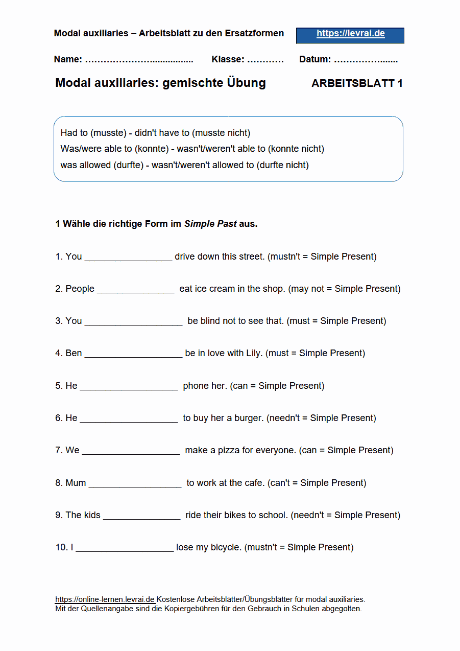 Arbeitsblätter für englische Modalverben (modal auxiliaries) im Simple Present und Simple Past: Die PDF-Arbeitsblätter für modal auxiliaries für „needn't, mustn't, may not, was/were allowed to, wasn't/weren't allowed to und didn't have to“ enthalten alle Übungen mit den Lösungen.