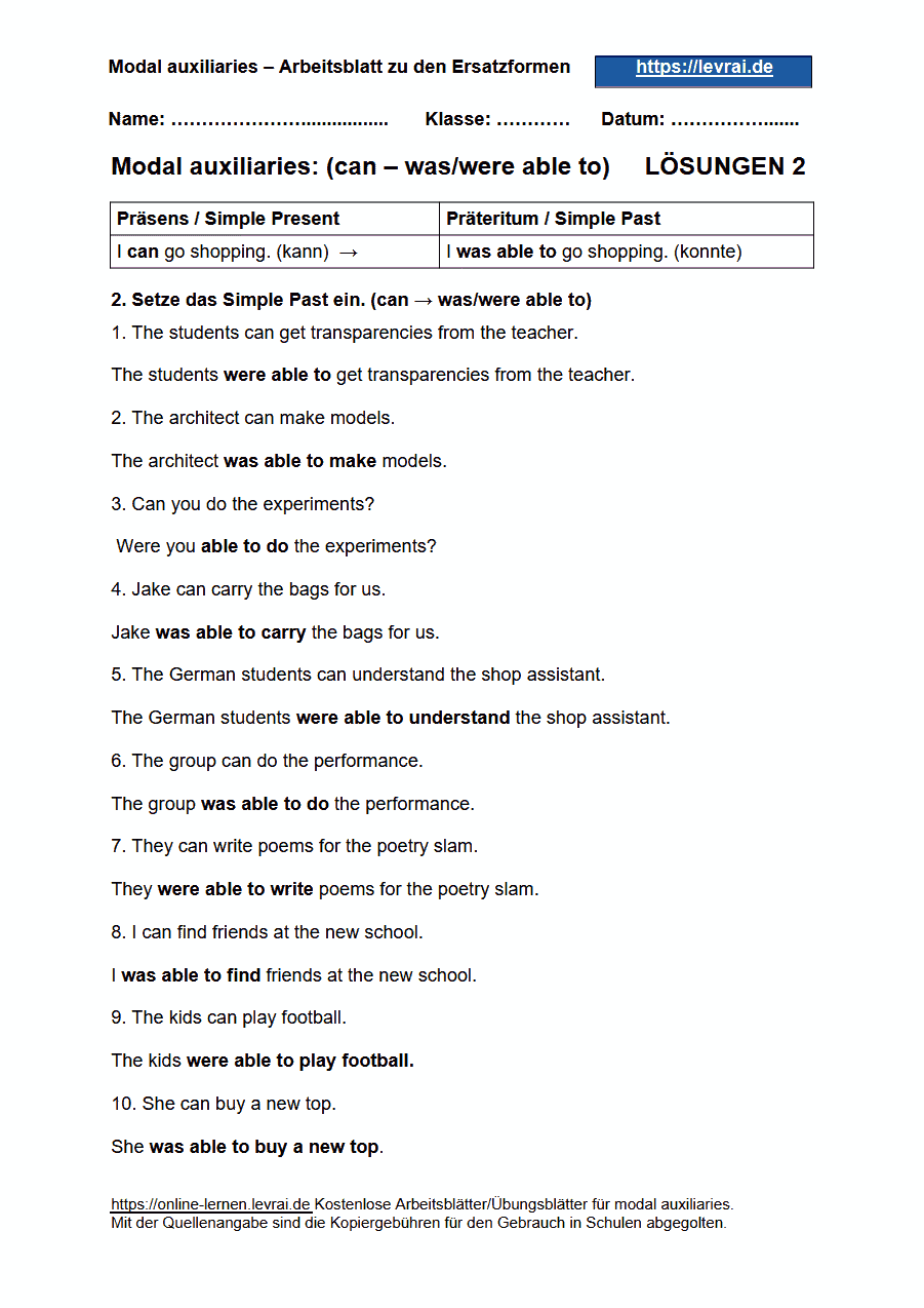 PDF-Arbeitsblätter 1 (6 Seiten) für englische Modalverben (modal auxiliaries) im Simple Present und Simple Past: Die PDF-Arbeitsblätter für modal auxiliaries enthalten alle Übungen mit den Lösungen.