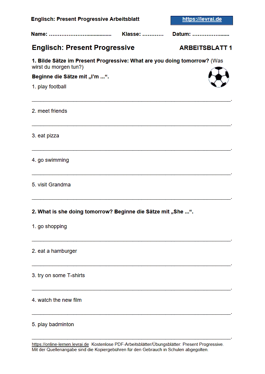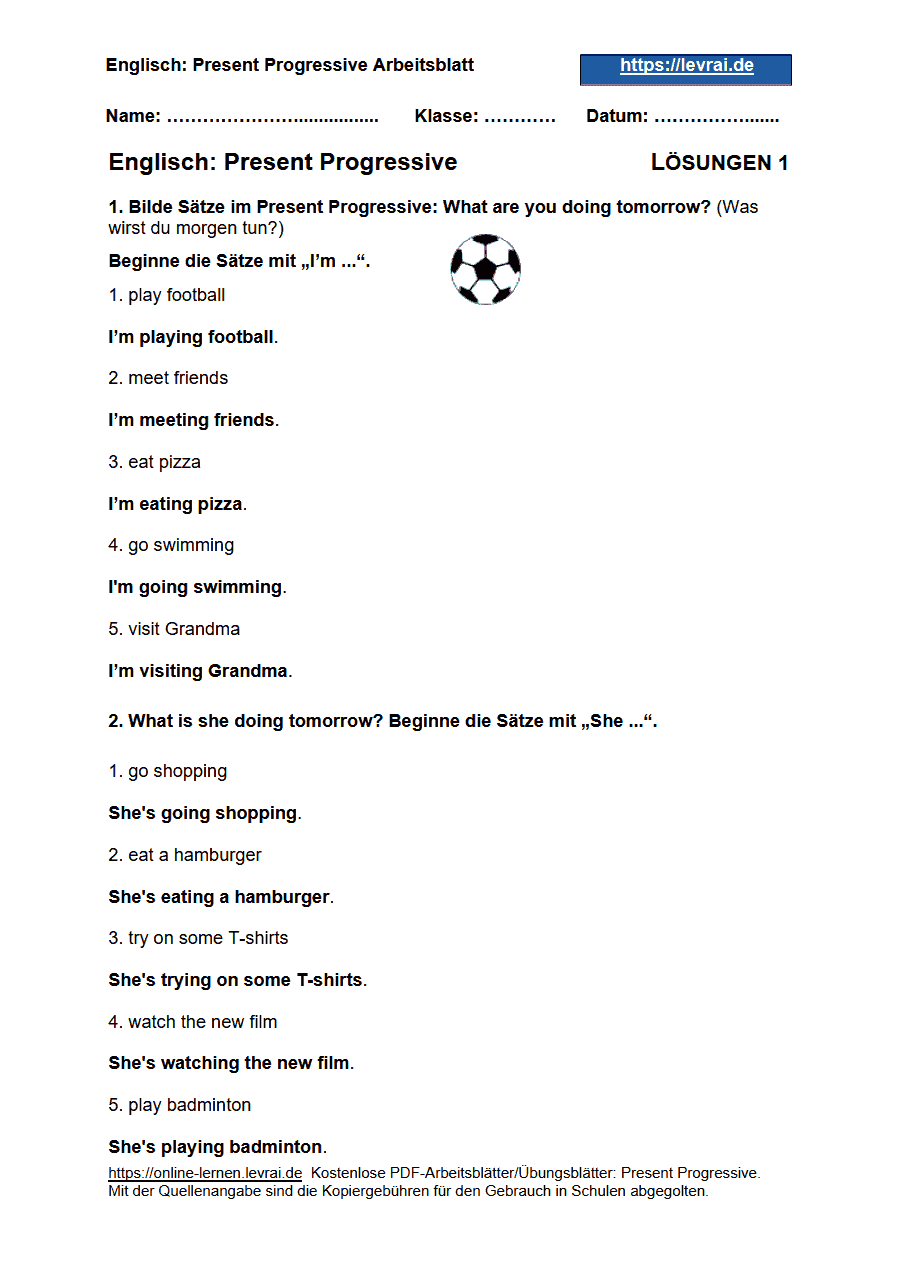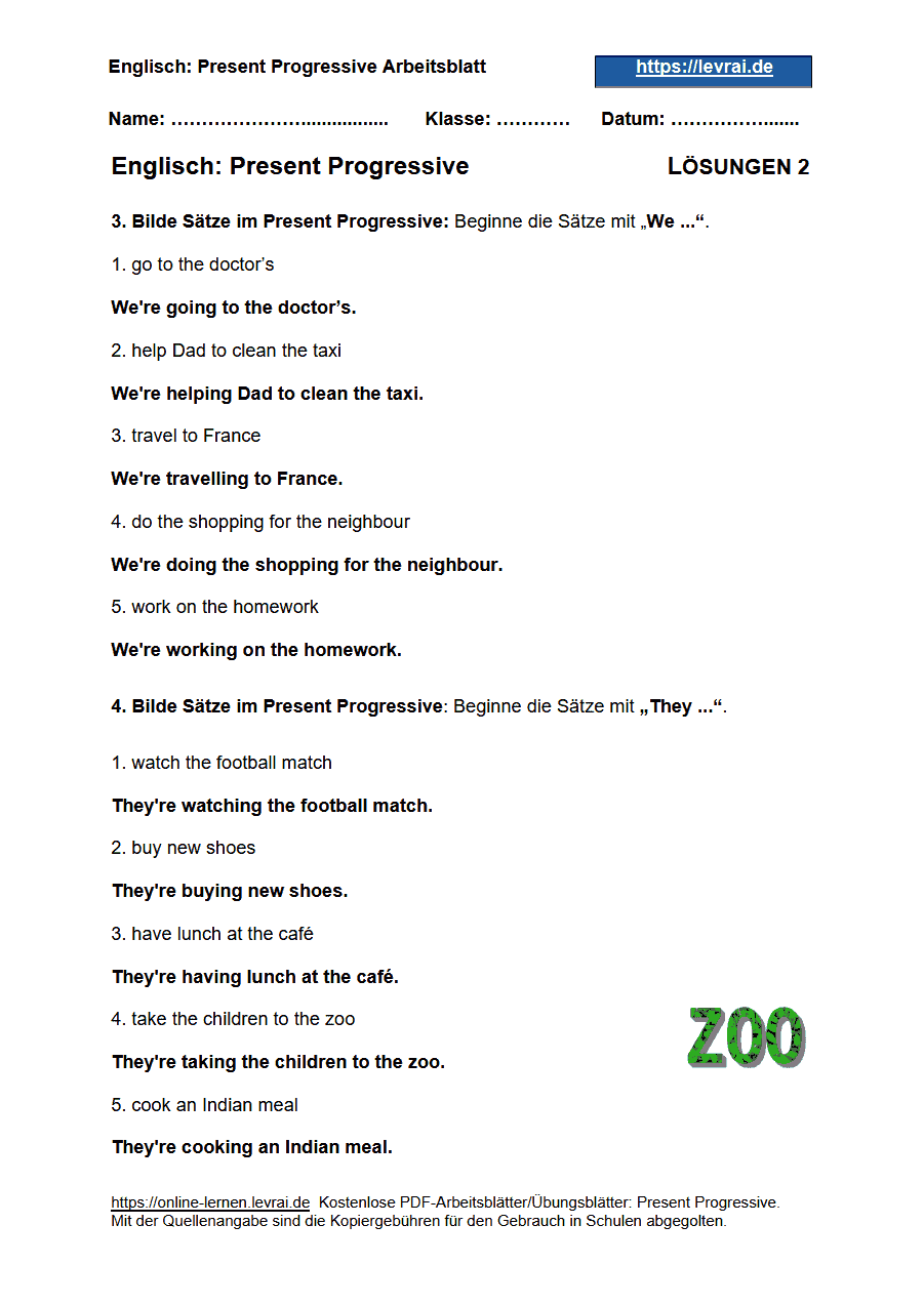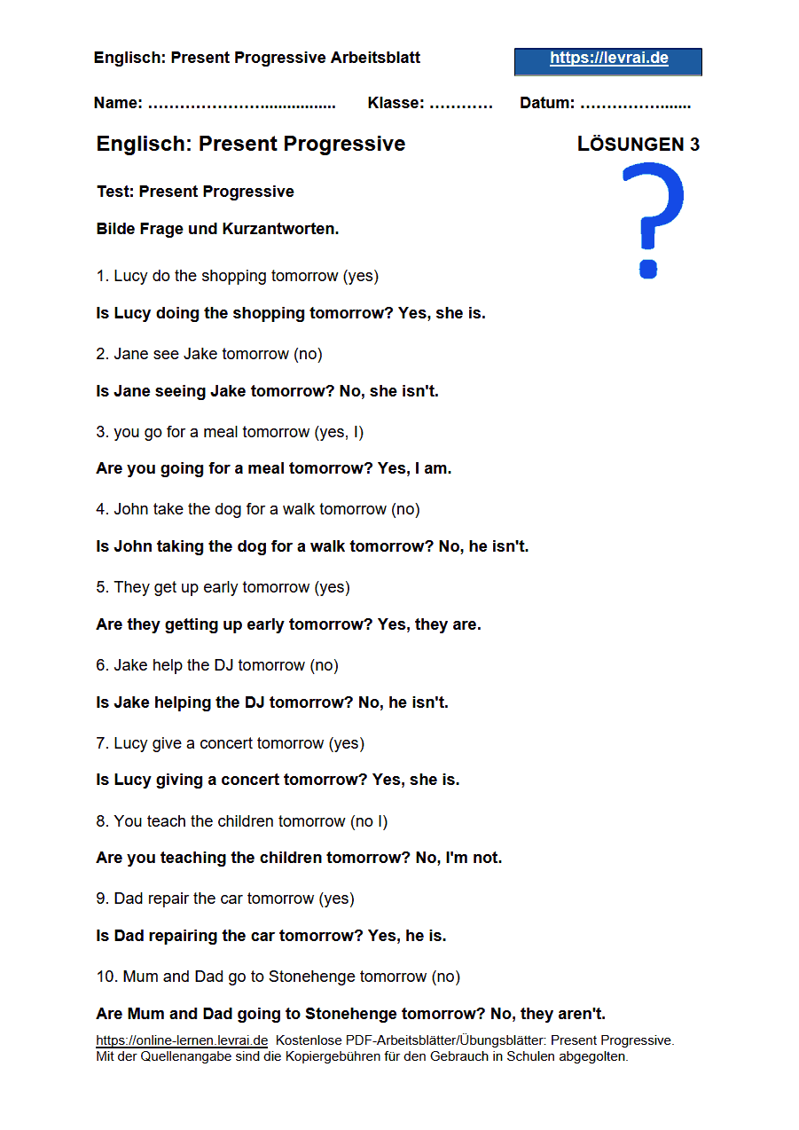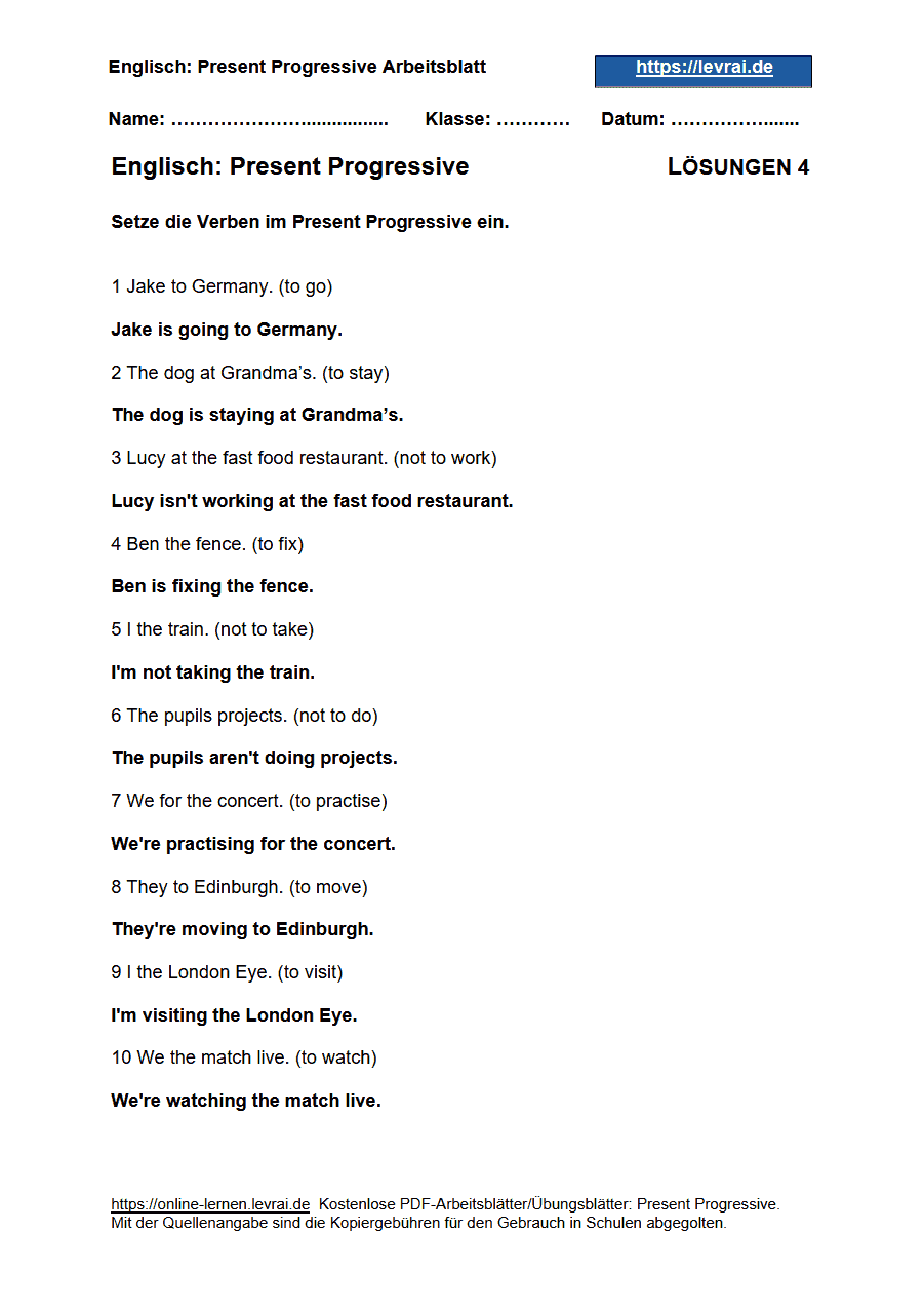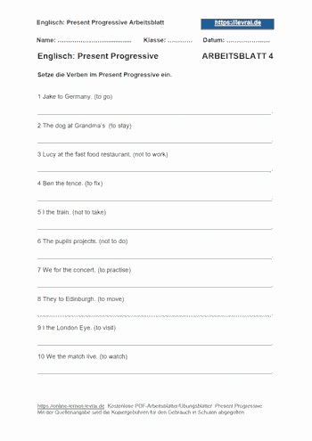 Arbeitsblätter für das Present Progressive: Die PDF-Arbeitsblätter für das Present Progressive enthalten alle Übungen mit den Lösungen.