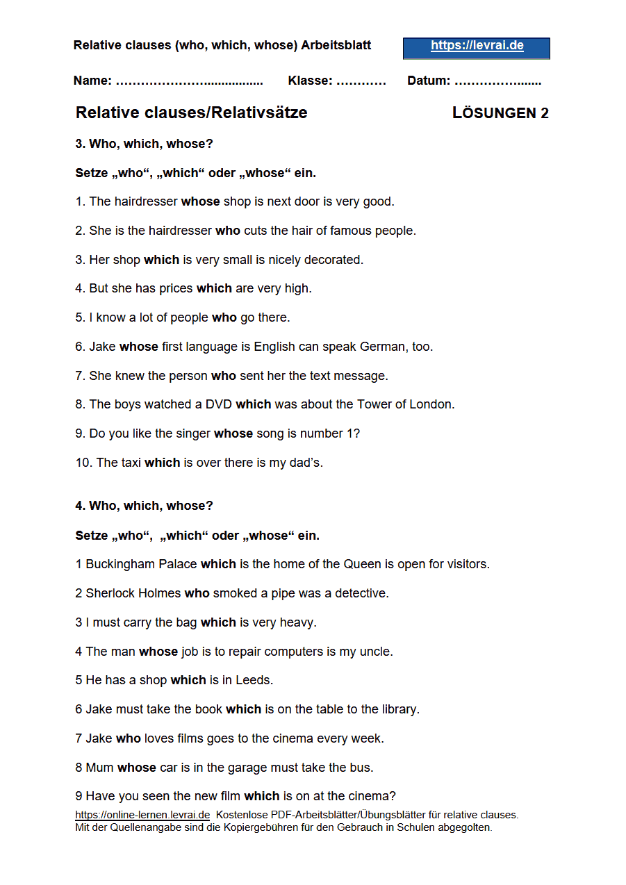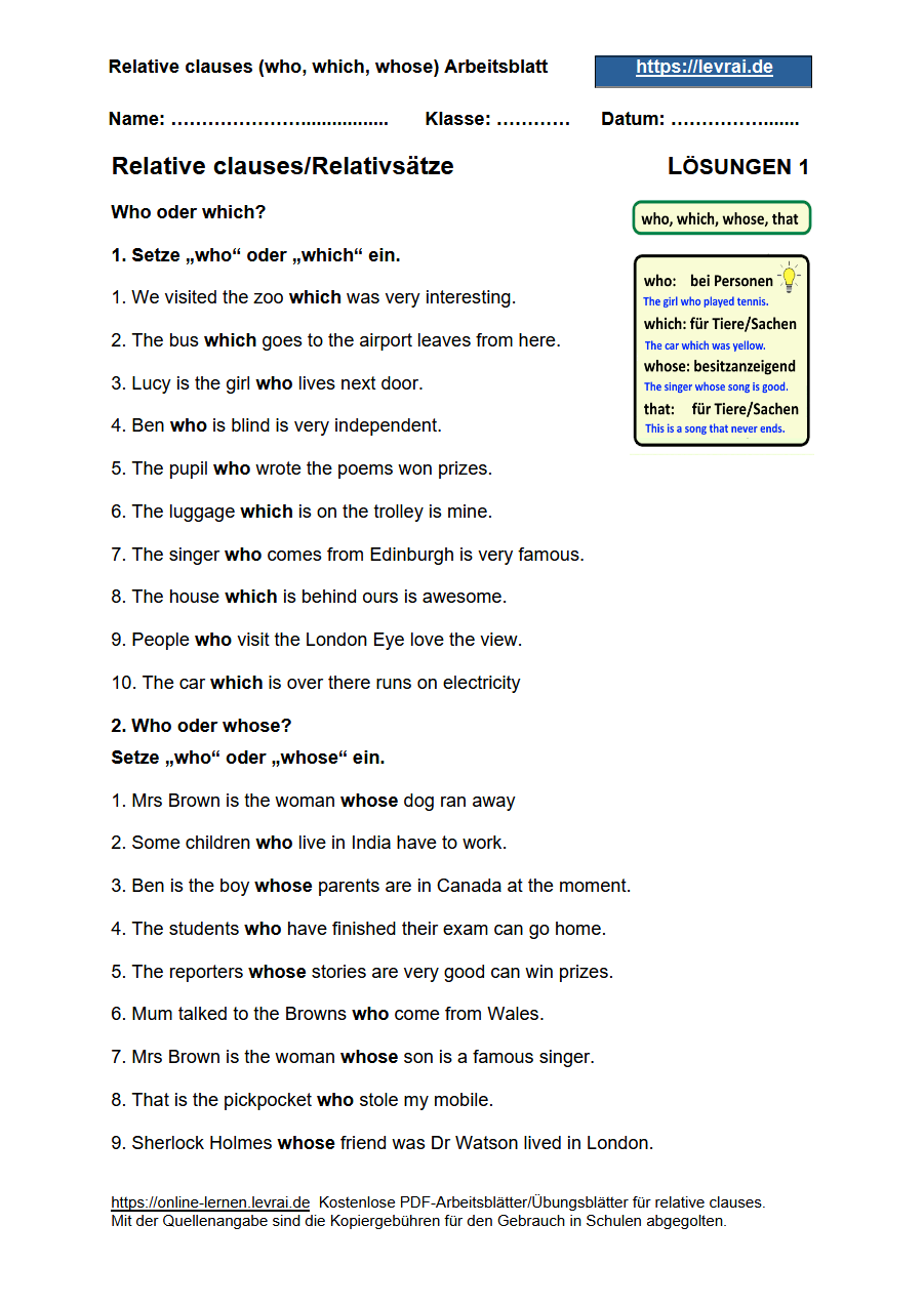 Who, whose and which with worksheets. Lerne die relative clauses mit Arbeitsblättern, Erklärungen und Beispielen. Die Übungen für die relative clauses/Relativpronomen eignen sich für Klasse 6, Klasse 7, Klasse 8 und Klasse 9.